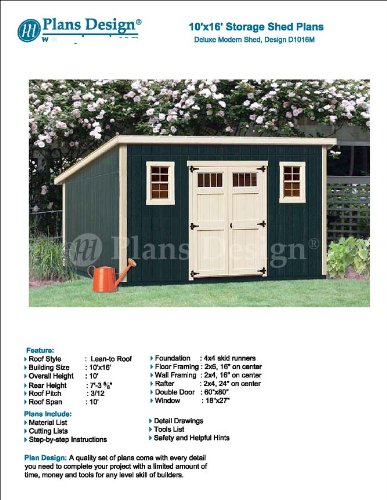 10′ x 16′ Deluxe Shed Plans, Modern Roof Style Design #D1016M, Material List and Step By Step Included